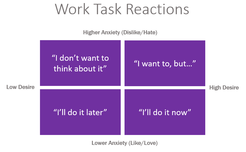 The example above is about how we react to tasks. It really helps us get honest about why we sometimes put things off when in fact they are the most important to be done!